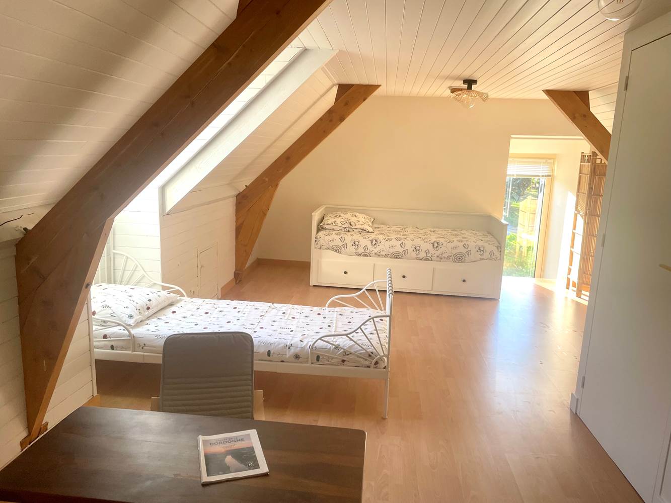 Profitez d'une location tout confort avec trois chambres et une mezzanine, pour une capacité de couchage de 8 personnes maximum, d'une cuisine toute équipée, 2 salles de bains et 2 toilettes séparés.